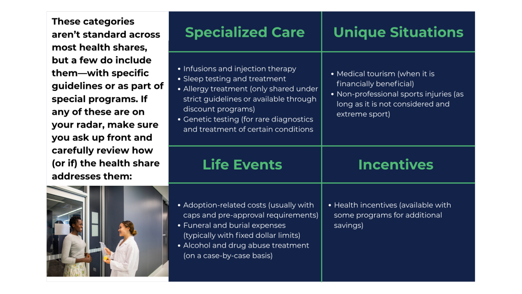 You’ll find that health shares can share in almost anything people typically look for—but it’s important to know that no single health share shares in everything.